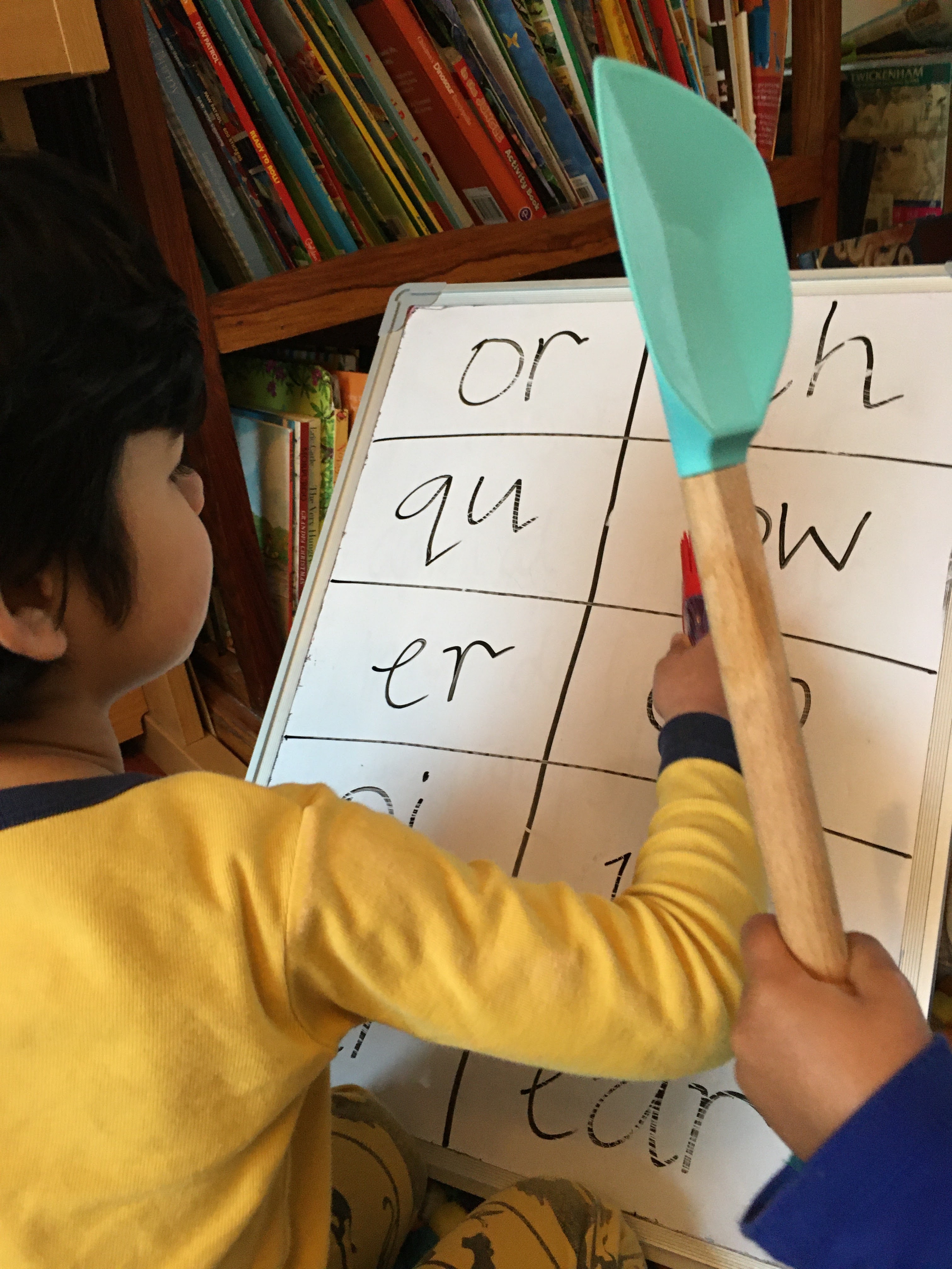 Like an ice storm in an abandoned teacup, Week 6 began. I was feeling ill, the boys were squabbling because the oldest wanted to re-classify all the animals into geographical groups, a task fiercely claimed by his younger sibling; our youngest was adamant that all the jigsaws should be emptied onto the kitchen floor and then keep him in my arms all day. After a tense start to the day, the dust settled. I distracted our four year old with a game, involving sounds written on a board, us reading them out and a spatula for bashing them with, whilst littlest joined in with the milk brush (jigsaw pieces remaining on the floor). Our eldest was smuggled upstairs to secretly classify animals under the desk whilst his Papa led a whole year school assembly online.
